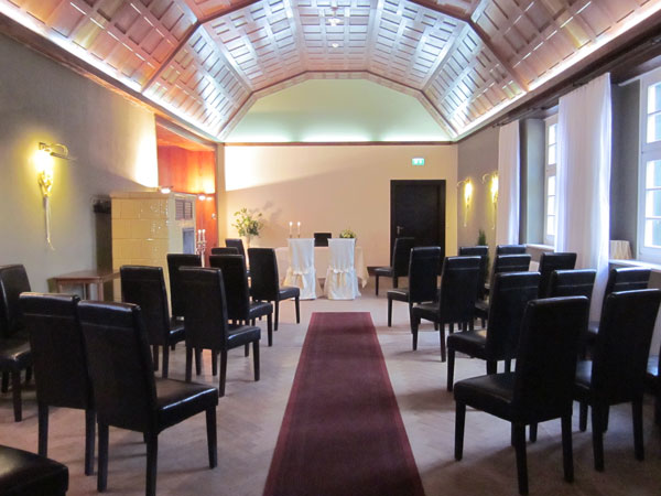 Standesamtliche Trauungen bis zu 60 Personen können entweder im festlich ausgestalteten historischen Speicher auf dem Hof stattfinden oder im stilvollen Ambiente des Bismarck-Saals mit seiner gewölbten Kassettendecke im 1. Stock des